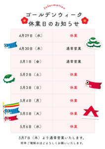 併せて、ゴールデンウイーク中の営業日をご案内いたします。